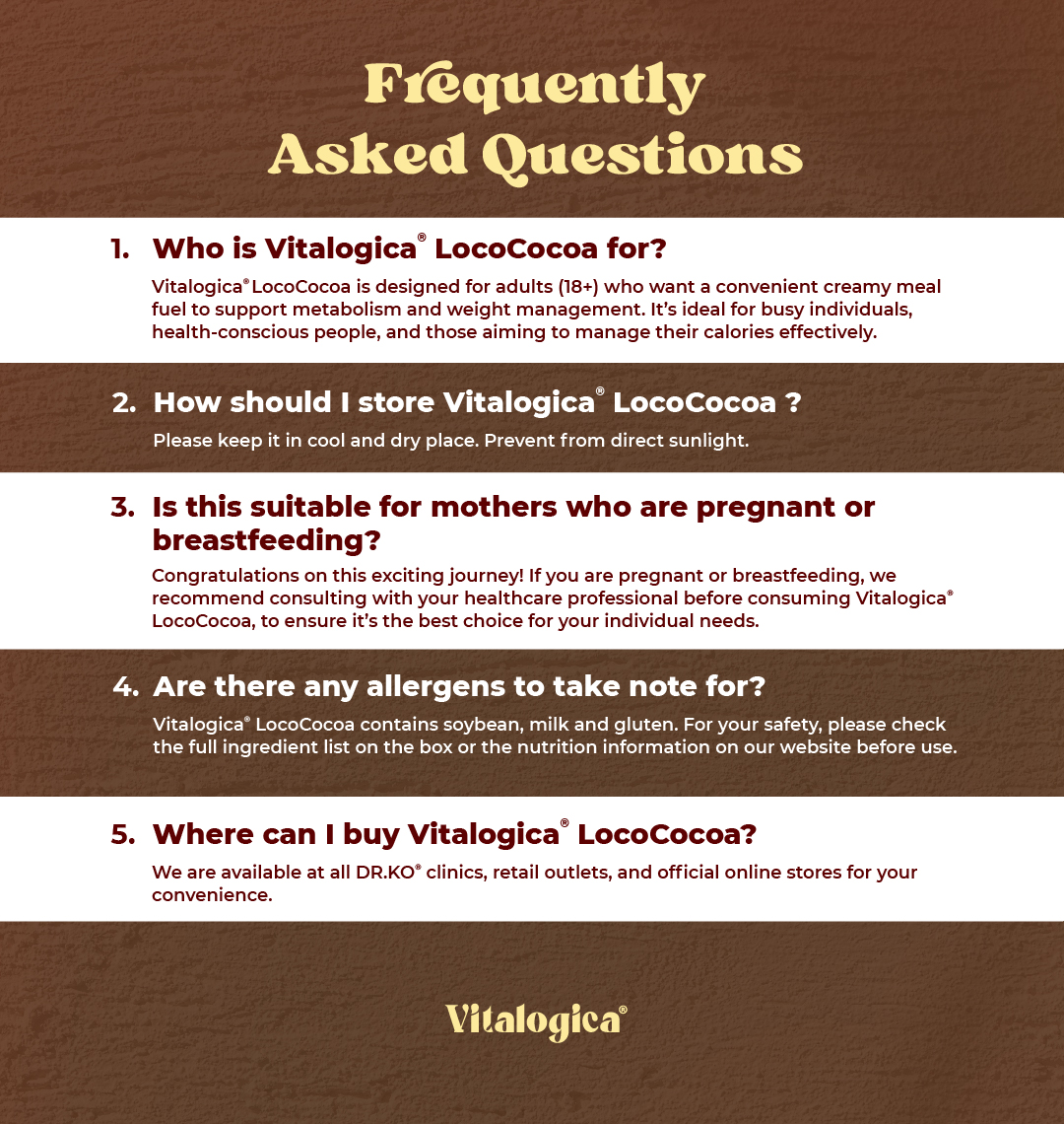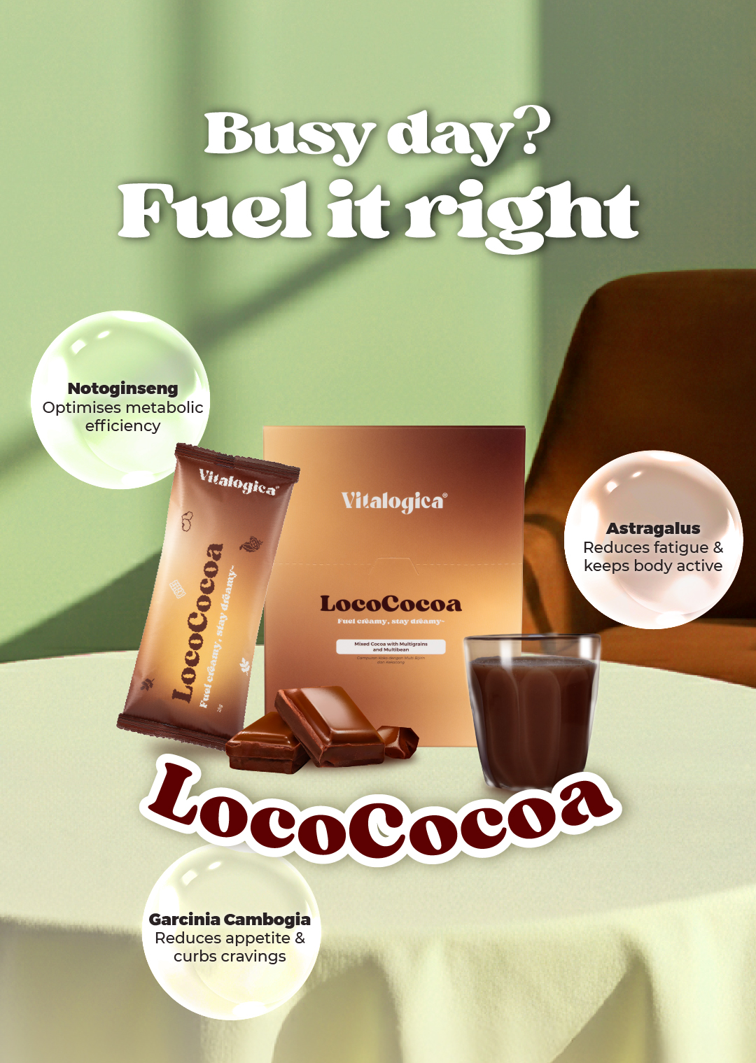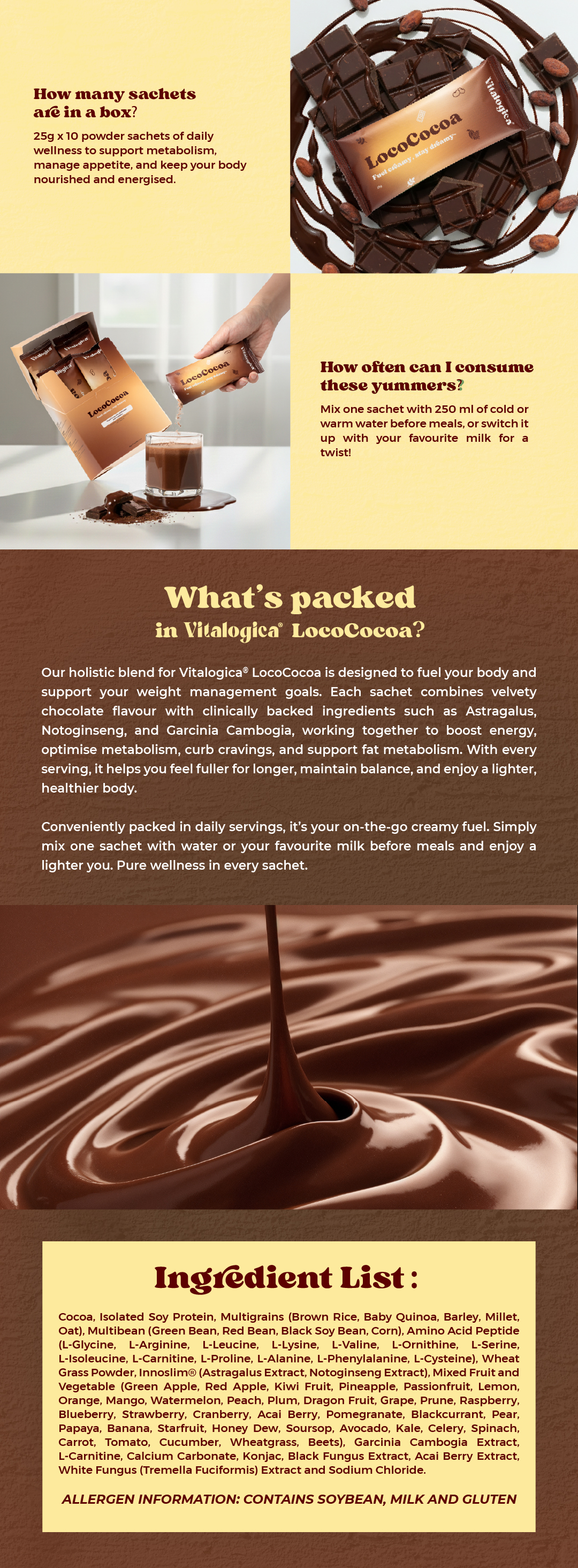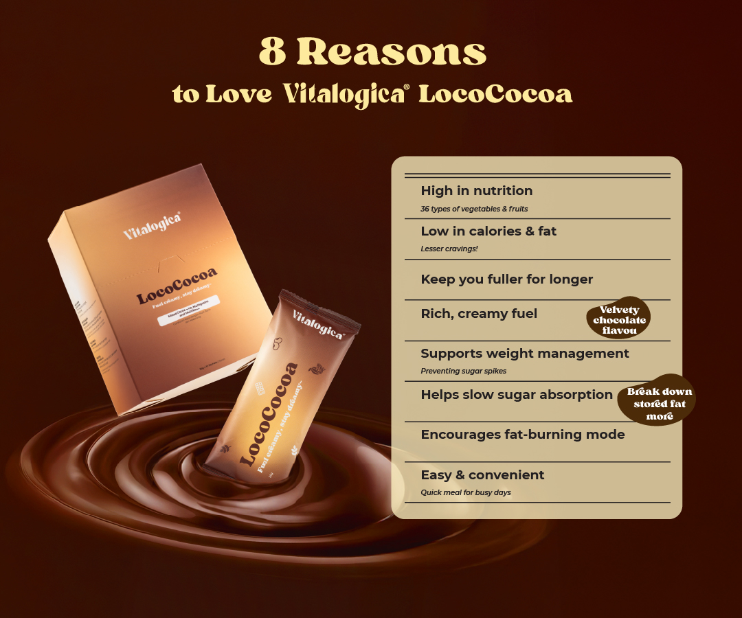 Vitalogica®️ LocoCocoa is a velvety chocolate-flavoured superfood meal replacement, thoughtfully formulated with botanical ingredients and premium nutrients to support weight management. Designed to keep you fuller for longer, it helps regulate energy use and support fat metabolism while fitting seamlessly into your daily routine for a lighter, more balanced body.