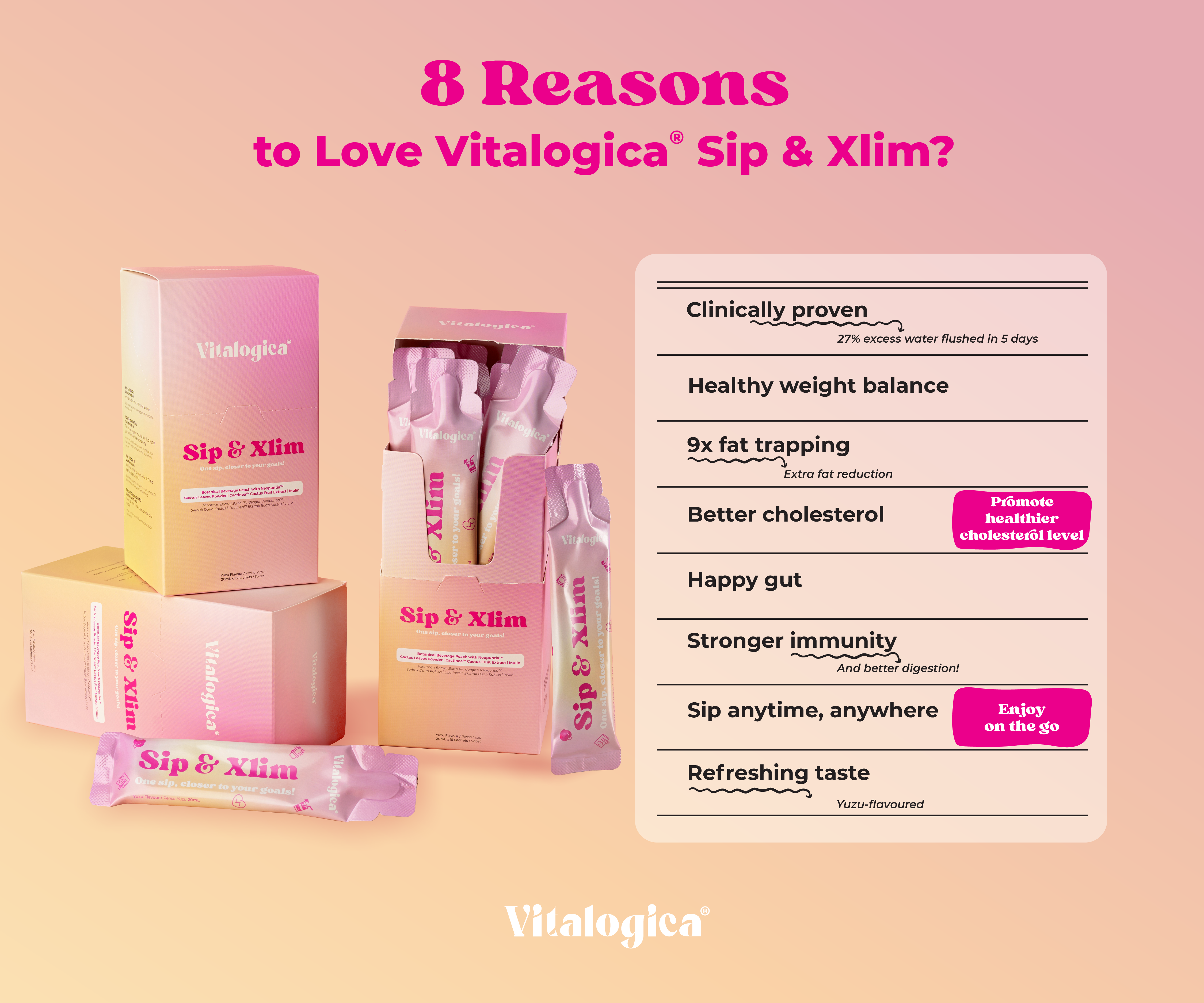 Vitalogica®️ Sip & Xlim is a refreshing yuzu-flavoured sachet powered by Neopuntia™️ cactus leaves powder, Cactinea™️ cactus fruit extract, inulin and other premium ingredients. It works from within to improve weight control by reducing fat absorption and water retention while supporting a healthy gut for a lighter, healthier body.
